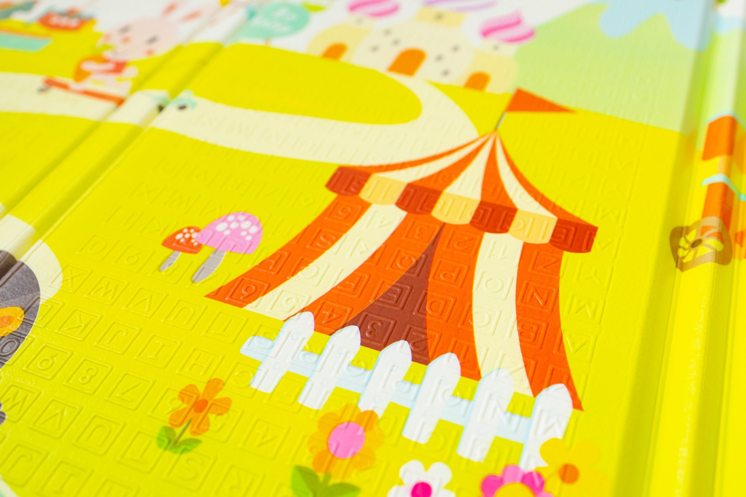Čak i veseli print na prednjoj strani podloge ima svoju edukativnu stranu – mali kvadratići koje vidiš zapravo su slova engleske abecede ili brojevi od 0 do 9!