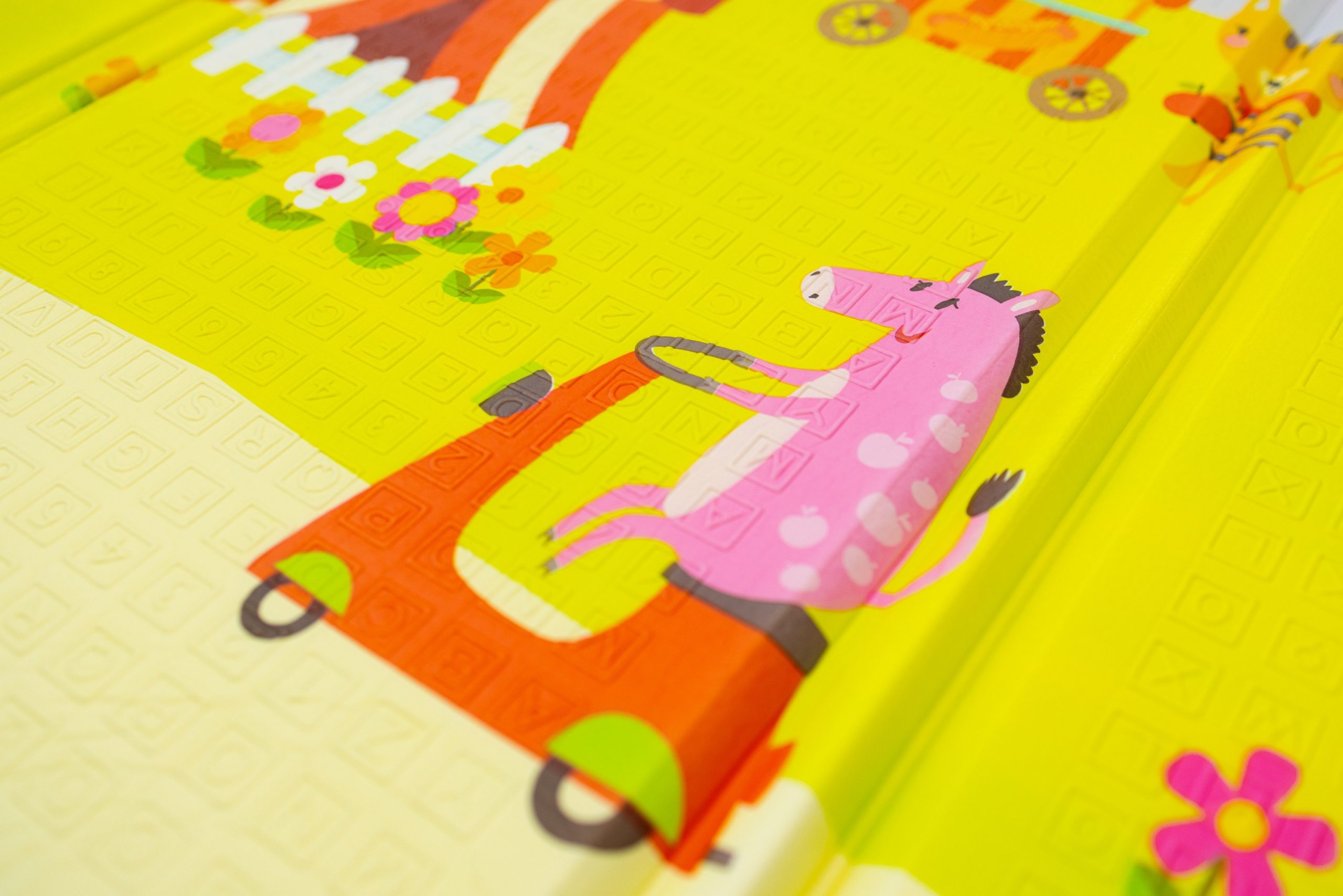 Svaka naša podloga je dvostrana, što znači da s jedne strane ima veseli, a s druge strane edukativni print, na kojoj je dizajn s početnim slovima engleske abecede.